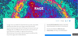 Alors on va sur www.sag2.com et on trouve quoi? Que le SAG2 est fabriqué par Virbac, une société française qui commercialise un appât qui, lorsque l’animal le mord, libère une substance contenant le vaccin. L’appât est soit posé soit largué par voie aérienne. Au Québec, la vaccination des ratons laveurs se fait par ce moyen avec le largage, parfois de 650 000 appâts.Le virus de la rage (genre Lyssavirus) est présent dans la salive de l’animal (chien, animal sauvage…) en fin de maladie. La transmission survient le plus souvent après la morsure par un animal contaminé, par griffure ou encore léchage sur la peau excoriée ou sur une muqueuse. La contamination d’homme à homme est exceptionnelle (transplantations d’organes, transmission de la mère au fœtus).Le virus rabique est neurotrope : il infecte le système nerveux et affecte son fonctionnement. Il ne provoque pas de lésions physiquement visibles dans le cerveau mais perturbe les neurones, notamment ceux qui régulent des fonctionnements rythmiques comme l’activité cardiaque ou la respiration. Après quelques jours à quelques mois d’incubation, l’individu atteint développe un tableau d’encéphalite. La phase symptomatique débute souvent par une dysphagie (difficulté à avaler) et des troubles neuropsychiatriques variés, notamment l’anxiété et l’agitation. L’hydrophobie est parfois présente. L’évolution se fait vers le coma et la mort (souvent par arrêt respiratoire) en quelques jours à quelques semaines. L’issue est toujours fatale lorsque la maladie est déclarée.Survie exceptionnelle sans traitement après expositionEn 2004 cependant, une jeune américaine a survécu à la rage. Elle avait été mordue sur le continent américain par une chauve-souris et n’avait reçu aucune vaccination préventive après exposition. Elle a subi un traitement très lourd en service de réanimation. Elle a survécu et a récupéré avec peu de séquelles. Si la survie de cette jeune fille a ouvert des perspectives en matière de traitement, la raison de sa survie ne peut être imputée à ce traitement et reste jusqu’à aujourd’hui inconnue. En effet, dans les autres continents, aucun patient traité de la même façon n’a depuis survécu.EpidémiologieLa rage est à l’origine d’environ 59 000 décès annuels dans le monde, principalement en Asie et en Afrique, le plus souvent suite à une infection transmise par un chien enragé. Chaque année, environ 17 millions de personnes reçoivent un traitement après l’exposition à des animaux chez lesquels on soupçonne la rage.Aucun cas de rage humaine acquise sur le territoire français métropolitain n’a été rapporté depuis 1924. En 2008, un cas humain a été rapporté en Guyane probablement suite à une morsure de chauve-souris. Des cas humains acquis hors du territoire français et diagnostiqués en France ont été aussi recensés, le dernier patient mort de rage en France a été pris en charge et diagnostiqué en région parisienne à la suite d’un séjour prolongé au Mali.